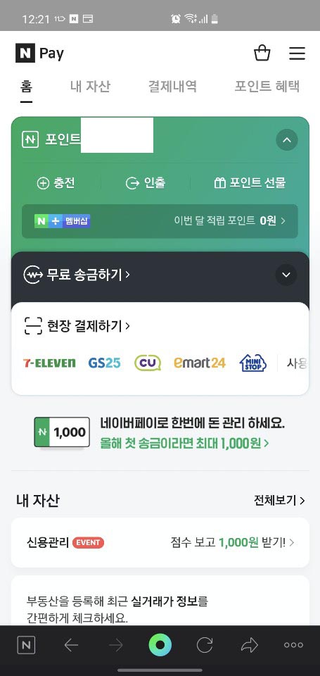 우선 카드를 삭제하기 위해서 네이버 페이 홈 화면으로 이동해 줍니다.